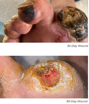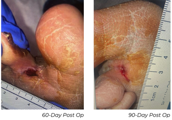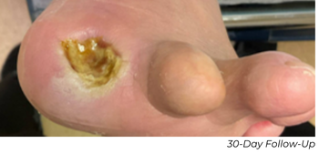 At his 30-day follow-up appointment, the wound was significantly smaller with healthy tissue formation, measuring 0.8x0.3 cm, down from the original wound size of 1x0.5 cm. At the 90-day follow-up appointment, his ABI was normalized at 0.93 and his toe pressure improved to 33 mmHg.