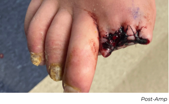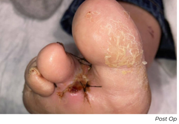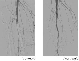 This patient needed a toe amputation one month after his procedure due to osteomyelitis. After one-month, the patient had wound dehiscence, therefore a repeat angiogram was performed. Repeat imaging showed excellent remodeling, no restenosis, and a strong, in-line flow. The wound has progressed significantly, and the patient is near healed.